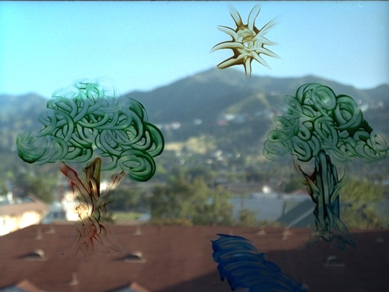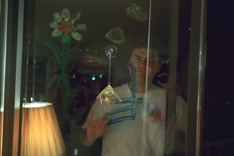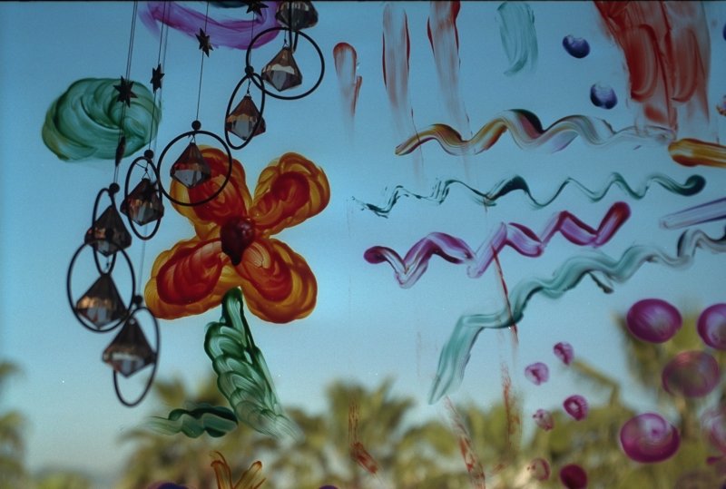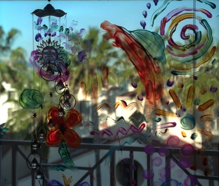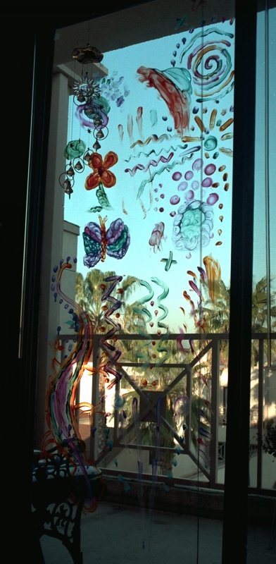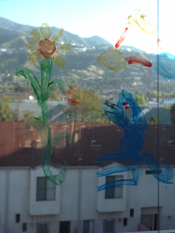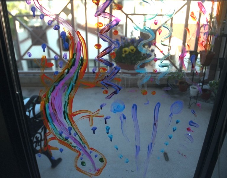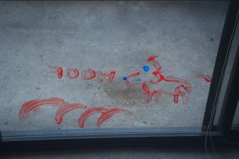 Finger painting on the patio doors,