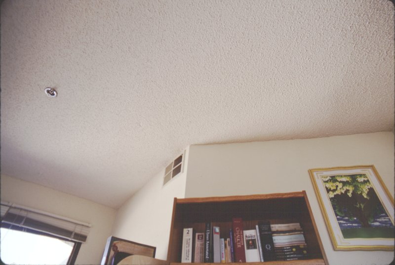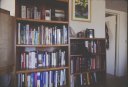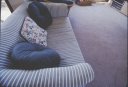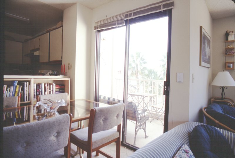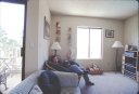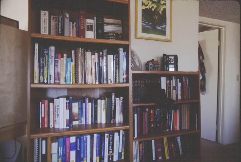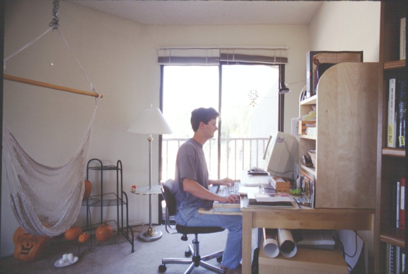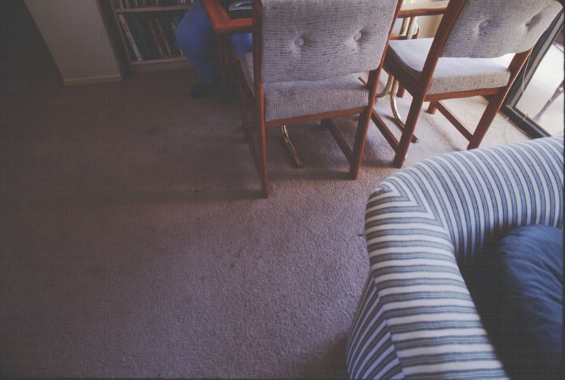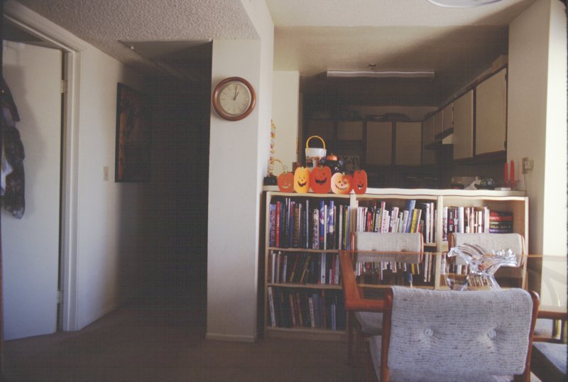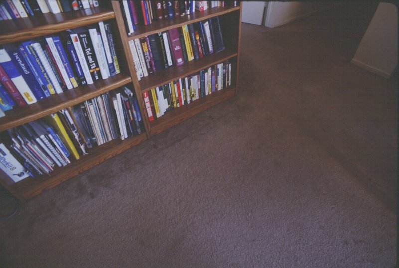 That gave me 95% of the results I wanted. Although the stitching was fairly accurate, it was not exactly perfect and some things inevitably didn't quite match up along the seams between two neighboring images. It took me a couple of hours of fussing with Gimp to straighten these out to my satisfaction. (The results still aren't perfect; you can see some of the artifacts if you look closely enough.) Some of these problems are due to imperfections in the wide-angle lens I used to take the pictures (this particular lens seems to distort things a bit too much on the edges of the frame, and things on the edges are significantly too dark), and some due to the fact that even on the tripod, the camera didn't exactly rotate around the nodal point of the lens, so there's a bit of unwanted parallax between different images--especially on things near to the camera like the couch in the foreground and the bookshelf behind the camera.