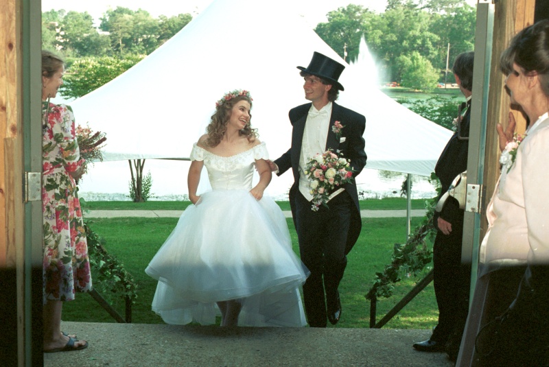 It seemed just a few minutes more before the band was packing up and guests were saying goodbye. (Where did the time go?) We took our cue to toss the bouquet and the garter, and took our exit--running back out the stairs under a barrage of birdseed.